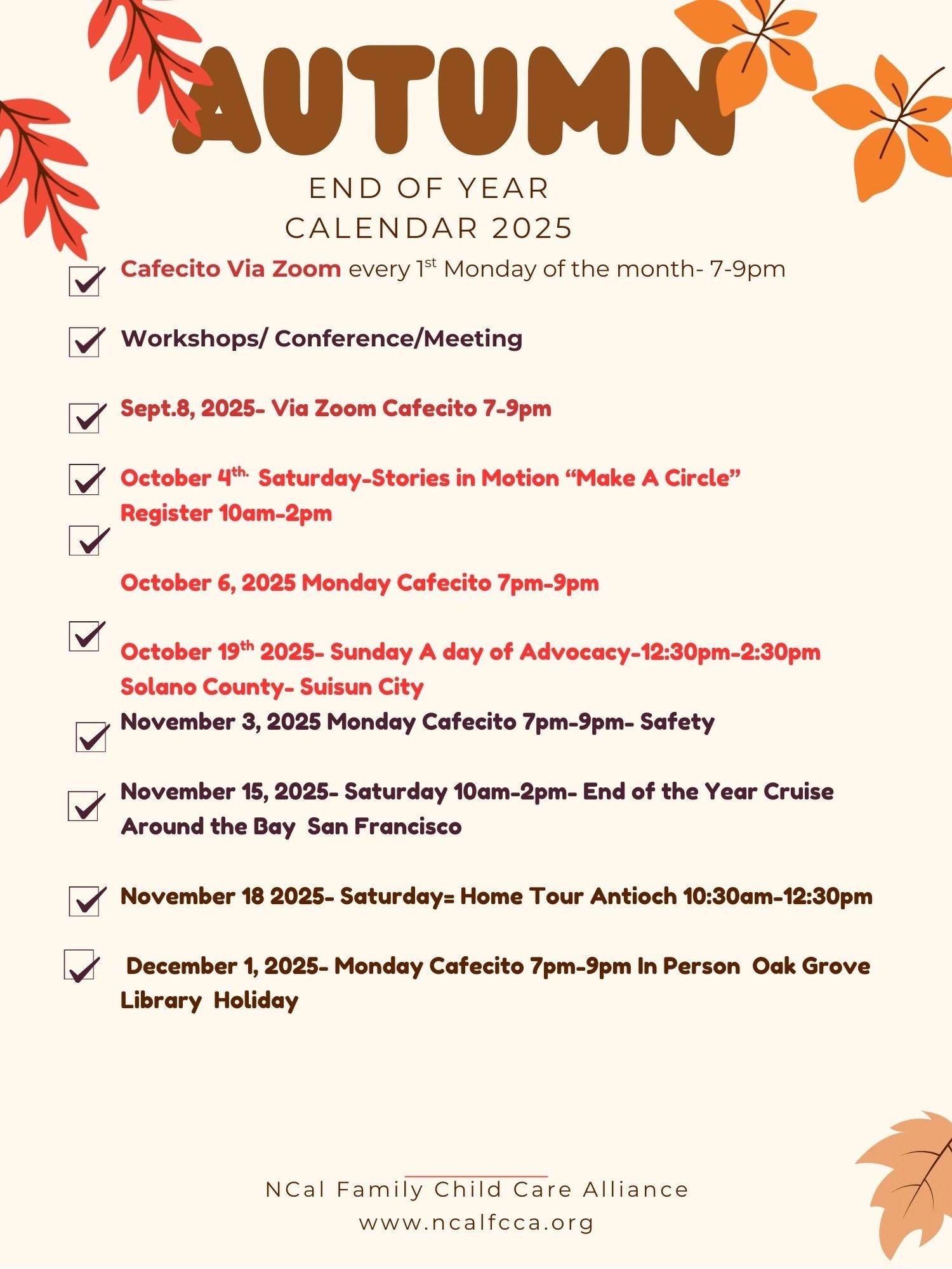 Declaración de misión: N CALFCCA se dedica a apoyar a los proveedores de cuidado infantil familiar del condado de Contra Costa, alcanzando estándares más altos consistentes con la investigación actual en el campo de la educación y el cuidado temprano al proporcionar recursos, información y capacitación para mejorar un ambiente hogareño se